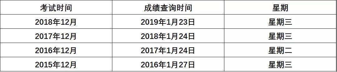 从上表可以看出,近4年的成绩公布时间均在1月下旬,周二或周三。2015年是5号考试,22天后出成绩;2016年是3号考试,21天后出成绩;2017年是2号考试,22天后出成绩;2018年是1号考试,22天后出成绩。