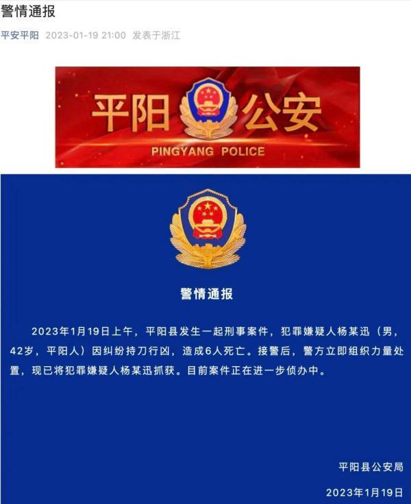 2023年1月19日上午,平阳县发生一起刑事案件,犯罪嫌疑人杨某迅(男,42岁,平阳人)因纠纷持刀行凶,造成6人死亡。接警后,警方立即组织力量处置,现已将犯罪嫌疑人杨某迅抓获。目前案件正在进一步侦办中。