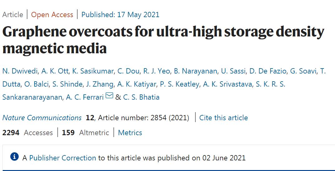 2021年5月17日有一篇研究论文,报道使用1-4层石墨烯大面积石墨烯薄层替代传统碳膜覆盖层,他们发现石墨烯比碳膜覆盖层具有更好的热稳定性、耐摩擦性能等。它有可能将磁存储密度提升到10Tb。