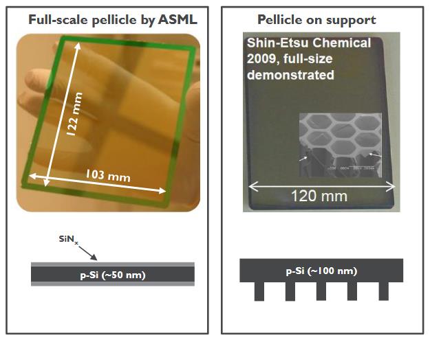 EUV掩模版为了防止污染,前面是要放一个透明防护罩的,它的要求极高。早先是用多孔硅p-Si上面沉积SiNx薄层。但是它达不到高功率EUV光刻量产的要求。