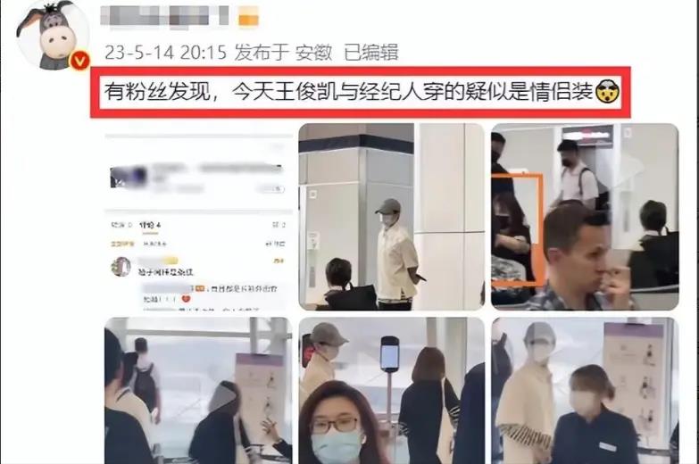 照片中,经纪人身穿黑色上衣,内衬的款式和王俊凯穿的一模一样。
