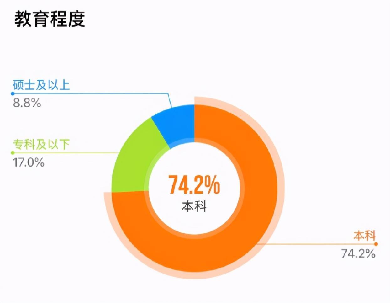 教育程度中,本科及以上的学历占比是83%,其中硕士及以上学历占比8.8%。要知道,微博用户本科率还不足4%啊!所以,这个占比不管是在互联网世界还是明星粉圈中,都算得上是比较高的了吧?