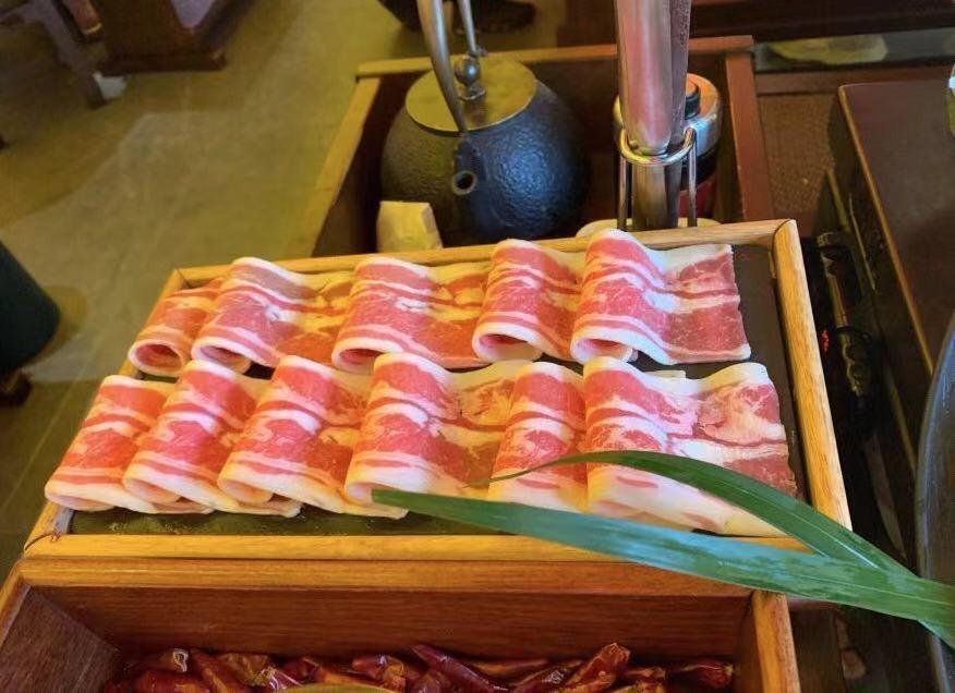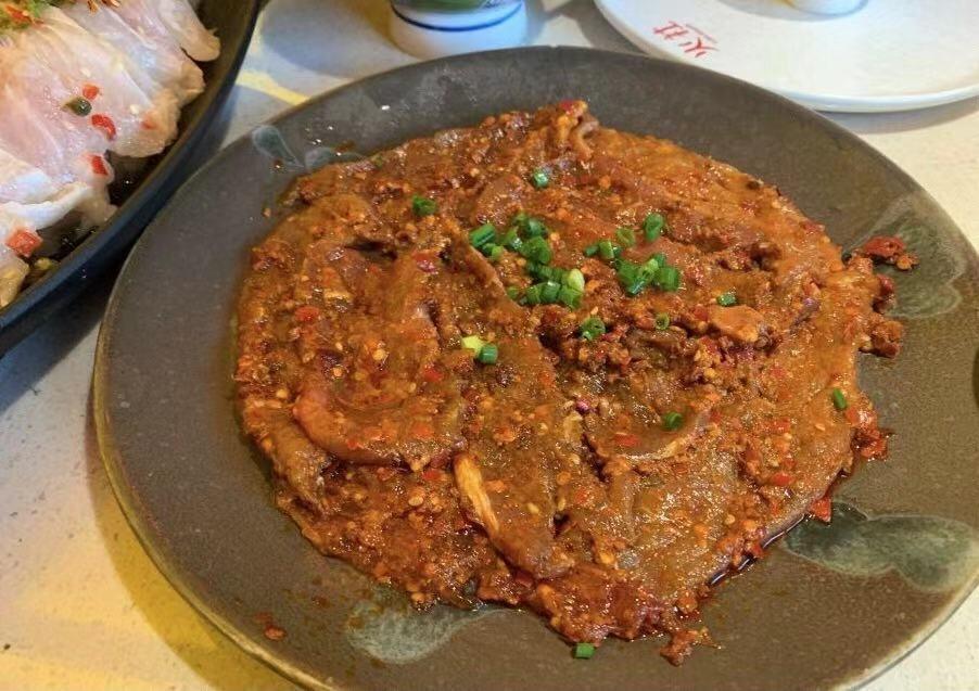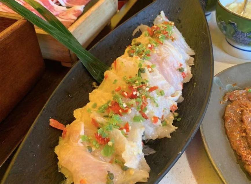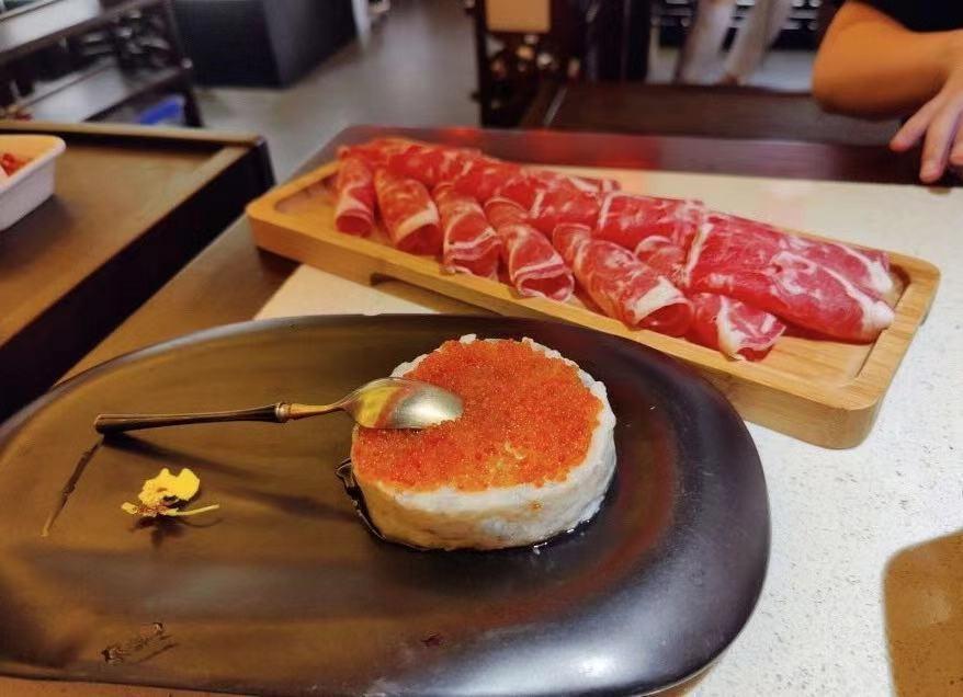 鲜鸭血也徒有其表,煮出来都没有鲜鸭血应该有的气孔,火社麻辣牛肉和肥牛算是中规中矩,家里买了牛肉自己切完烫就是这个味,没啥特点。鲱鱼籽虾滑这个还行,可以请店员帮忙下到锅里,他会把鲱鱼籽和虾滑拌在一起后一块块入锅,吃起来还挺Q弹的。秘制双椒巴沙鱼也不错,鱼片很嫩,而且熟得很快,应该一两分钟左右就可以吃了,也没有刺,吃起来很方便。