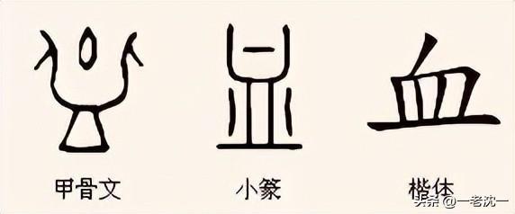 小篆的“血”字,无疑是从甲骨文演化而来——下面都为表示祭祀之器皿,上面中间的“三角”或“一”,为“牲血”之象形。