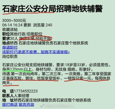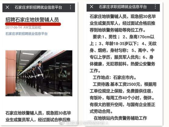 近日,网络上出现“石家庄市公安系统招聘地铁辅警”的消息,“月薪5000+”“包吃住”“周末双休”等等,让人心动不已。