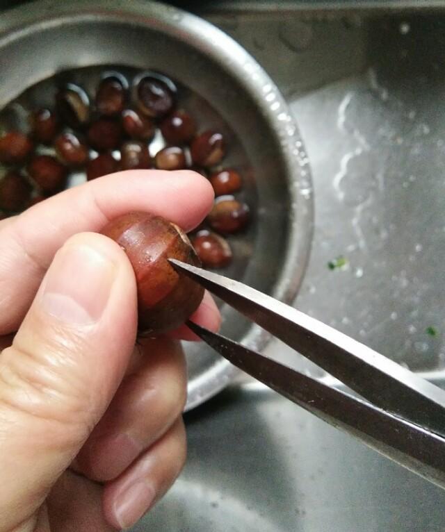 生的板栗不是很干的情况下,直接用水一下,然后用拇指和食指捏住板栗的两头,用剪刀直接横向剪口,在用相同方法竖向剪口,形成十字花刀。