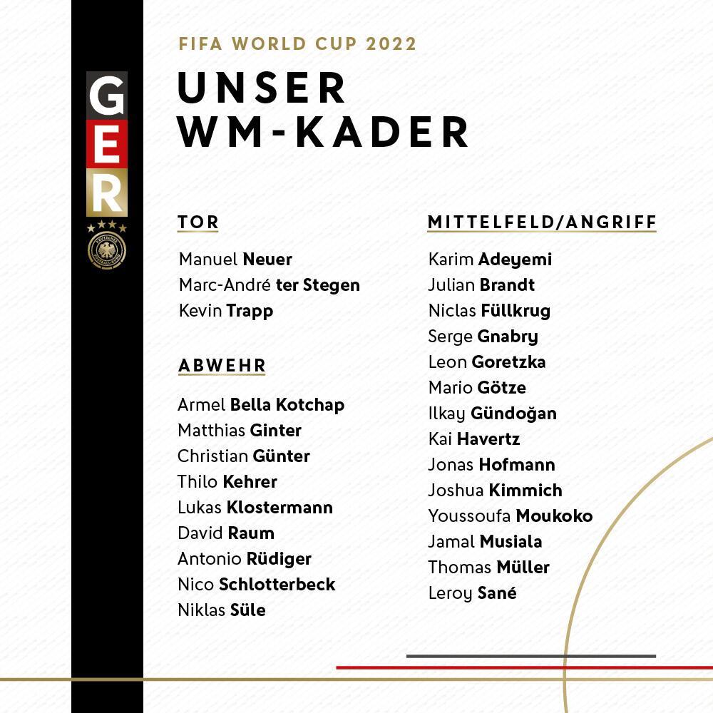 北京时间11月10日晚间,德国国家队公布了参加2022年卡塔尔世界杯的26人大名单,诺伊尔、穆勒、哈弗茨、格策和17岁的穆科科等人悉数入选,罗伊斯、胡梅尔斯和维尔纳等球员无缘名单。