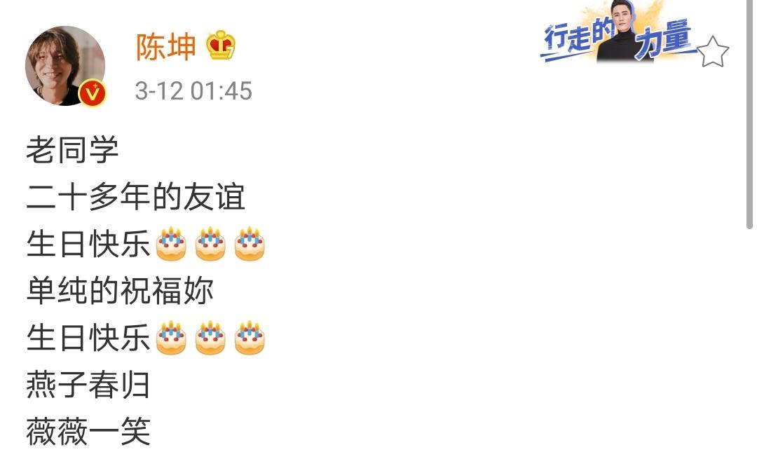 随后,另外一位老同学陈坤也在社交平台上发文,并没有艾特赵薇,但说的是谁,大家一目了然:老同学,儿时多年的友谊,生日快乐,单纯地祝福你,生日快乐,燕子春归,微微一笑!