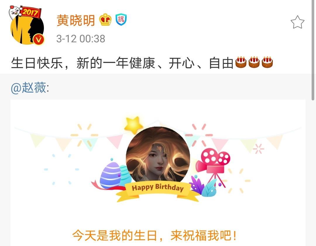 凌晨零点三十八分,黄晓明更博,为其送上祝愿:生日快乐,新的一年健康、开心、自由!