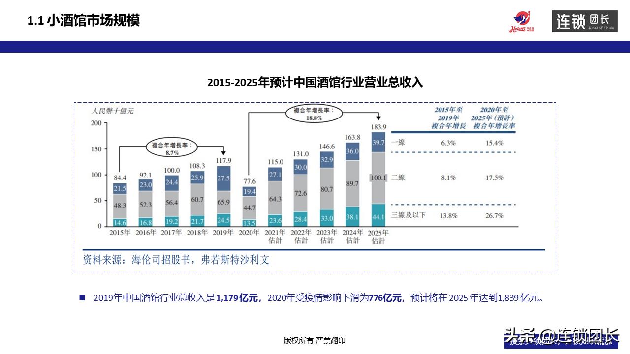 就目前而言,2019年中国酒馆行业总收入为1179亿元,2020年受疫情影响下滑为776亿元,而海伦司营业额8.18亿,占总份额的1.1%。