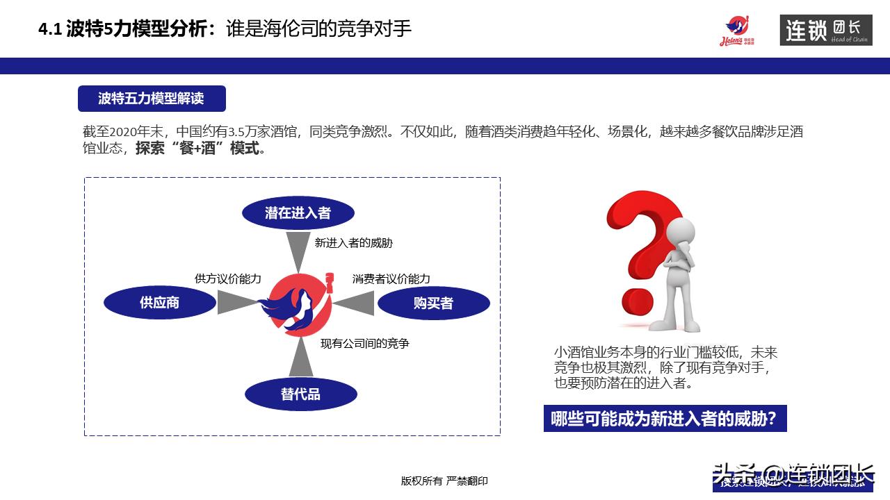 小酒馆业务本身的行业门槛很低,未来竞争肯定更激烈,除了现有竞争对手,我们猜想一下,根据波特五力模型分析:谁还有可能是海伦司的竞争对手?