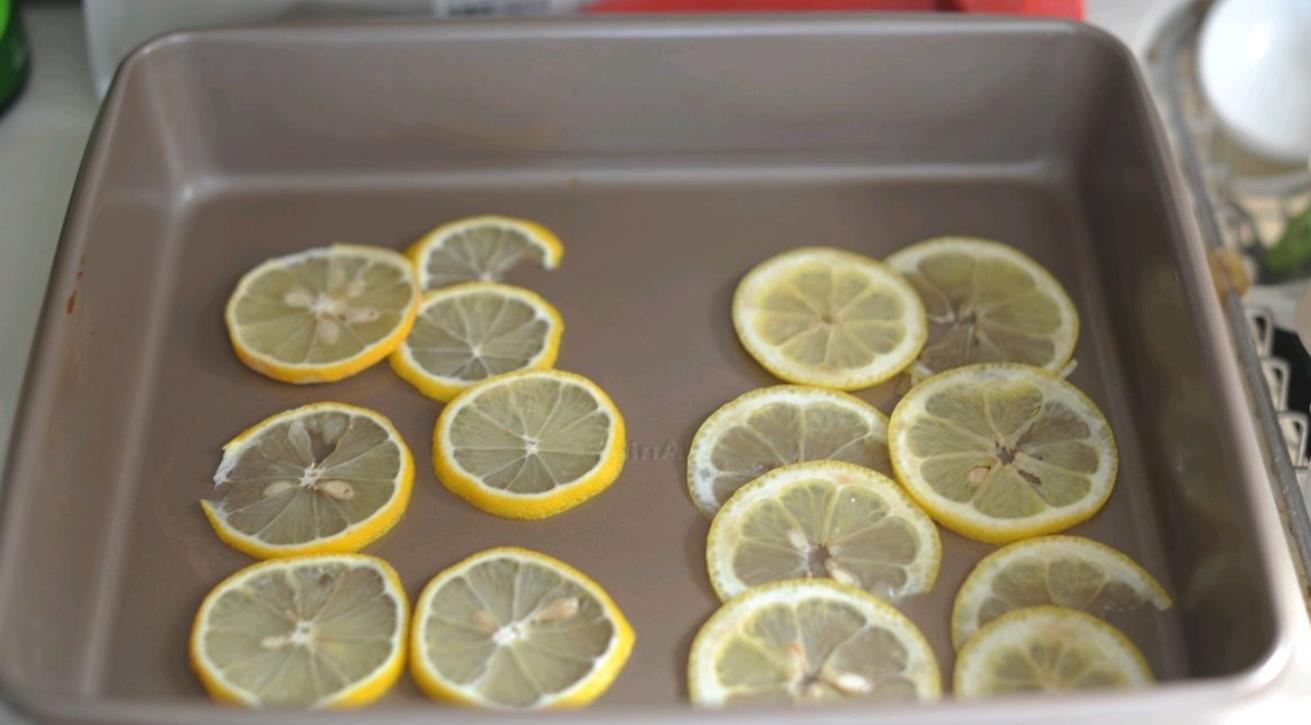 6:将柠檬切片然后均匀的铺在烤箱盘中。