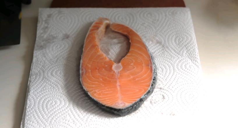 4:三文鱼用清水洗净然后用厨房纸吸干水分。