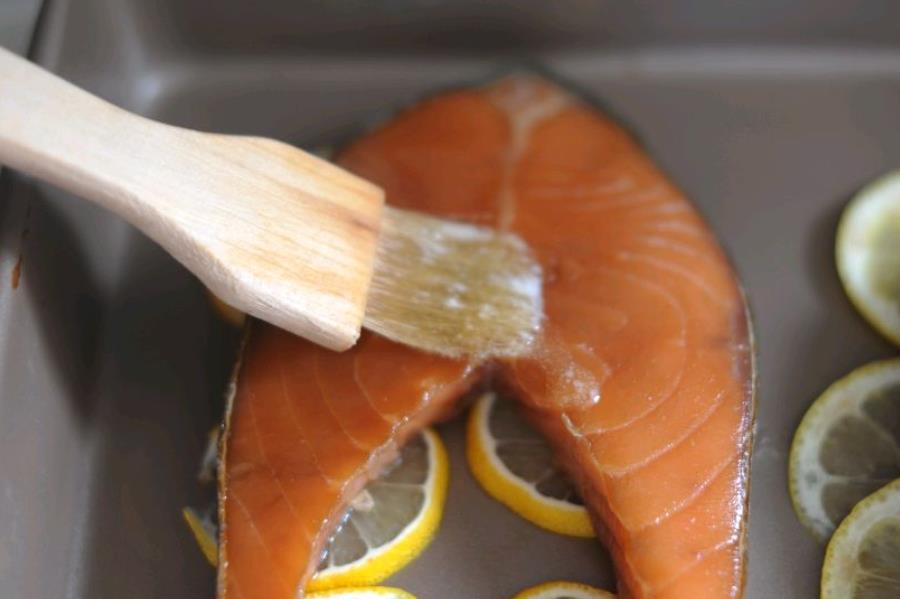 8:黄油加热融化然后将腌制好的三文鱼取出,放在铺好柠檬的烤盘上,然后刷上无盐黄油液。