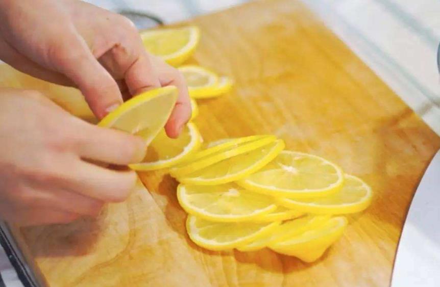 7:柠檬切半,然后竖切刀但是不切断。