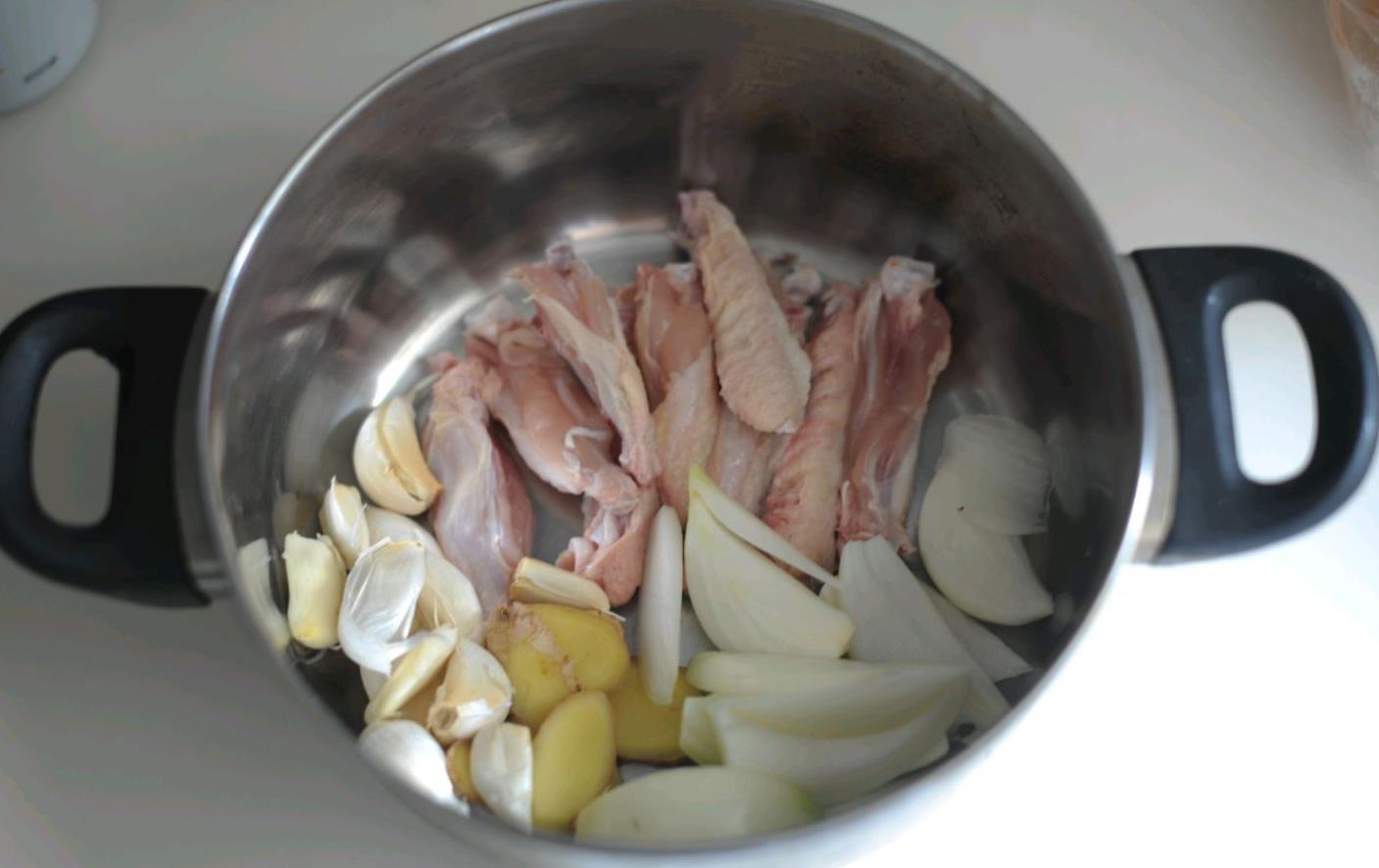 1:先做照烧汁,把大蒜剥皮、洋葱切块、生姜切片、鸡骨头洗净放进大碗中。