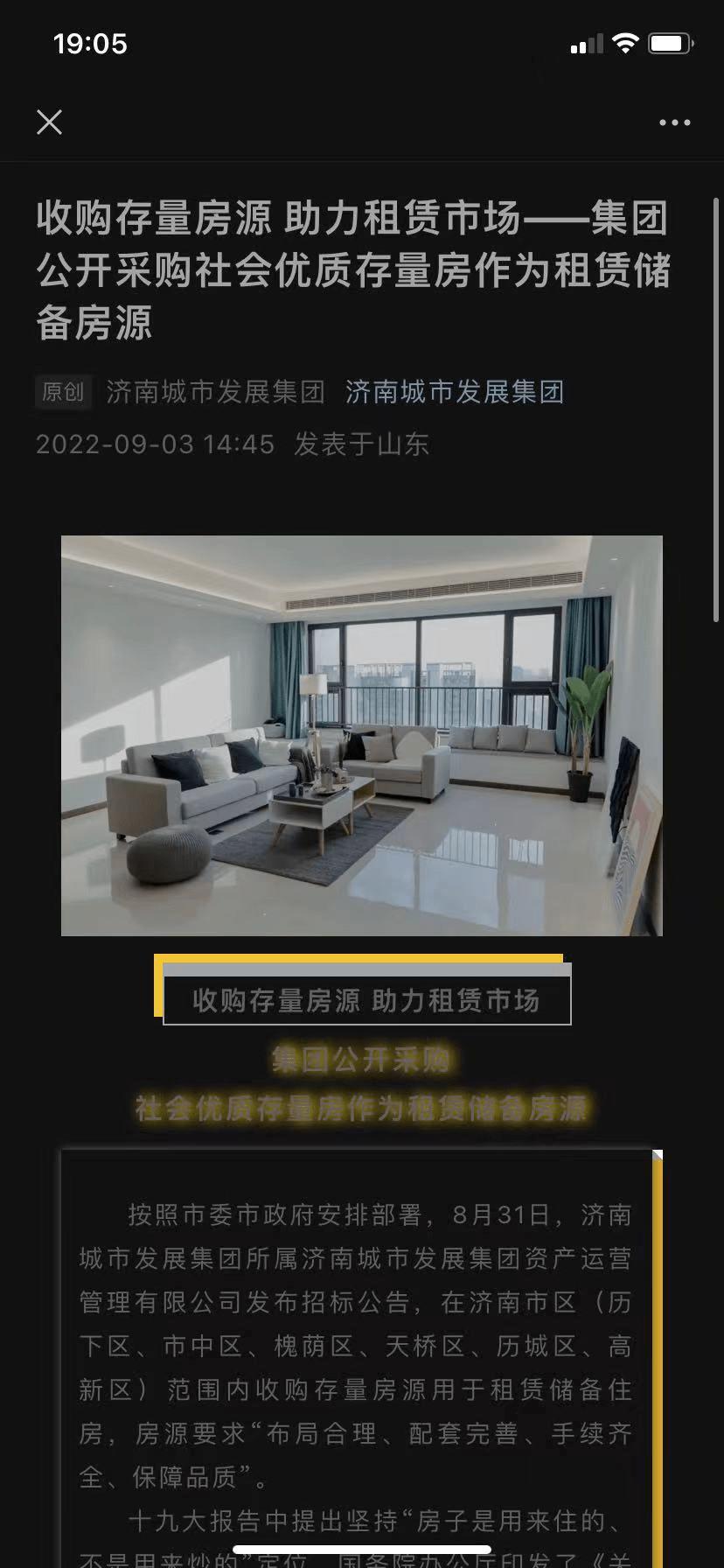 9 月 5 日,济南市国资委官网发布《收购存量房源 助力租赁市场——集团公开采购社会优质存量房作为租赁储备房源》。