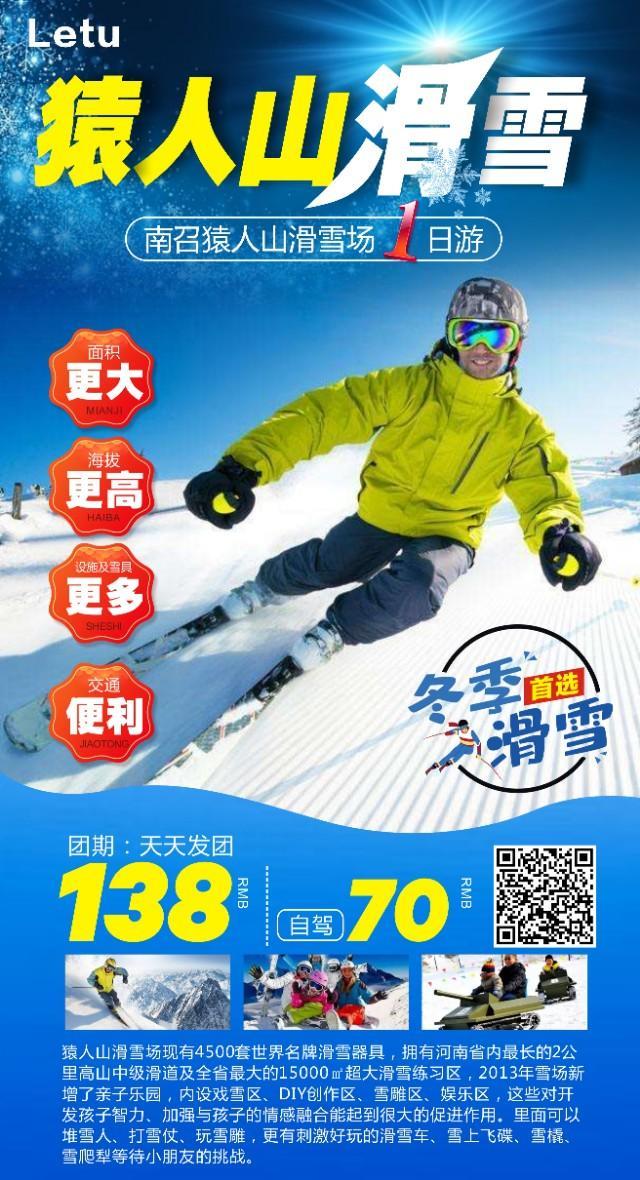早7点指定集合地点集合出发赴猿人山滑雪场,10:00左右到达滑雪场,统一办理手续后自由活动,猿人山滑雪场位于世界地质公园伏牛山腹地-南召县马市坪乡,占地面积8平方公里,区域最高点海拔1800米,滑雪场基地海拔1300米,雪场现有4500套世界名牌滑雪器具,拥有河南省内最长的2公里高山中级滑道及全省最大的15000㎡超大滑雪练习区,可容纳4500人同时滑雪,6000人同时进行雪上娱乐项目,2013年雪场新增了亲子乐园,内设戏雪区、DIY创作区、雪雕区、娱乐区,这些对开发孩子智力、加强与孩子的情感融合能起到很大的促进作用。里面可以堆雪人、打雪仗、玩雪雕,更有刺激好玩的滑雪车、雪上飞碟、雪橇、雪爬犁等待小朋友的挑战。下午15:00集合返程,18:00左右到达南阳,结束愉快行程!