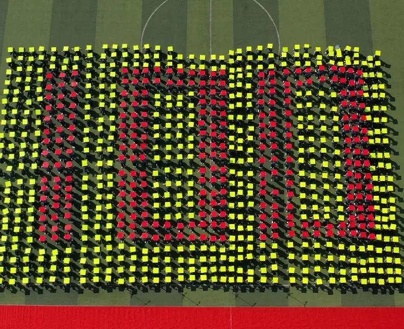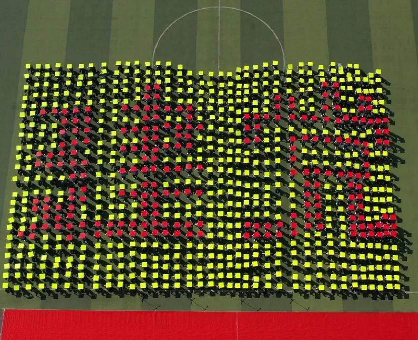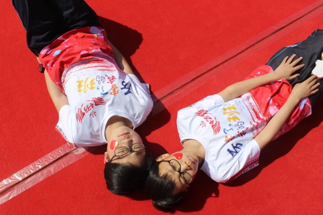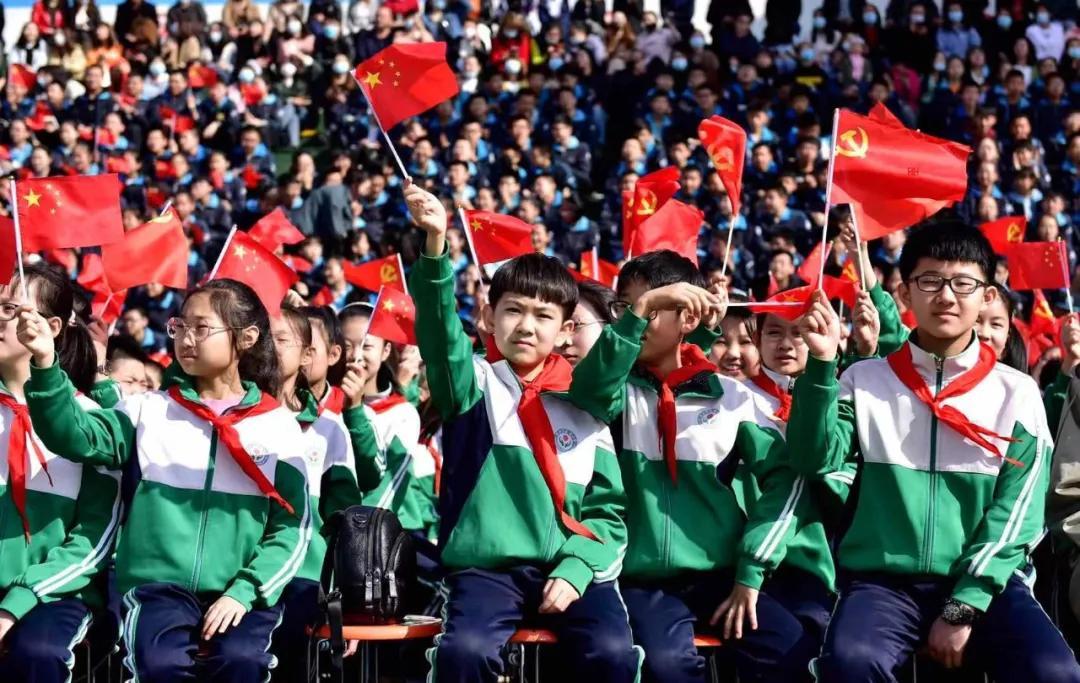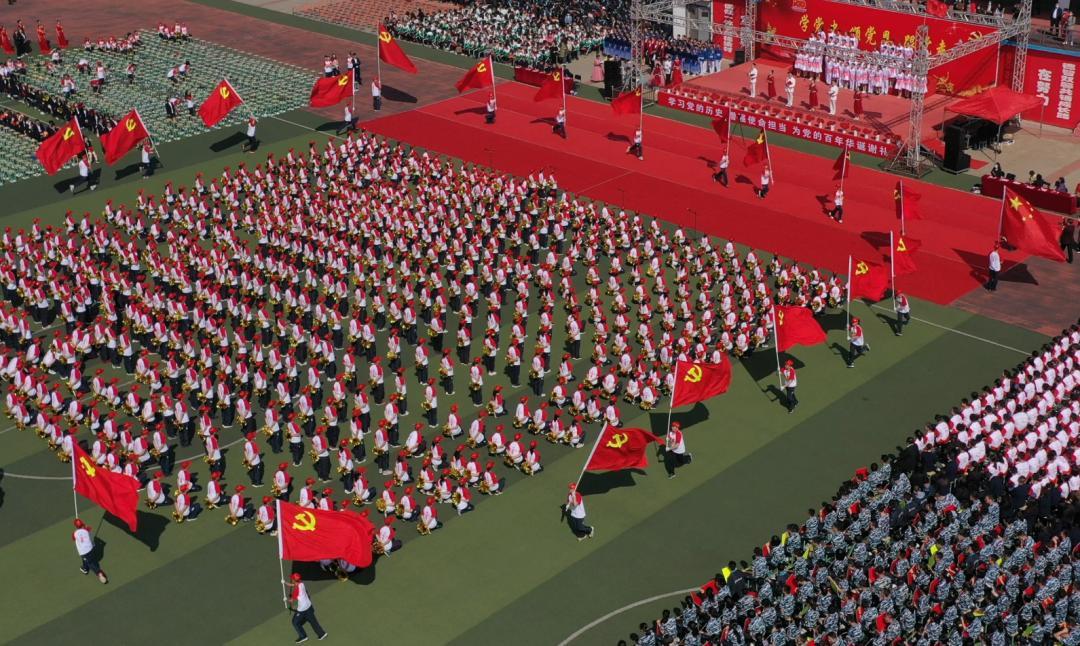 “快看!这是数字‘1921’‘1949’”“看!这是‘红船’,还有‘党徽’”……观众席上的家长们惊喜地发现,当熟悉的“没有共产党就没有新中国……”的歌声响起的时候,一支高举红、黄两色方形纸板的大型方阵上场了,数千名学生动作整齐划一、活力四射,通过不停反转手中“色块”拼组成的数字和图案,生动地讲述了百年党史历程。