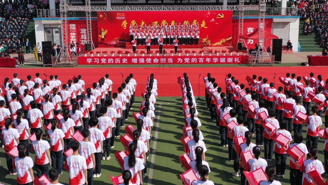 从位于体育场正北舞台上方的阶梯式观众席,向下俯瞰,一场由峪宏中学全校七千师生展开的以“学党史 颂党恩 跟党走”为主题的大型诵读歌唱会,正在精彩上演。