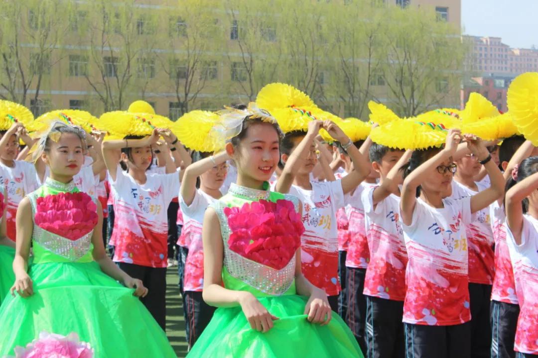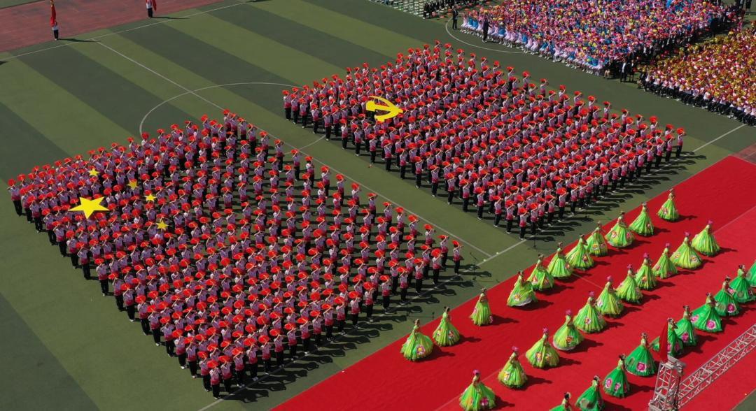 “从小爷爷对我说,吃水不忘挖井人……”伴随着悠扬的歌声,身穿节日盛装的舞蹈方队翩然起舞,而手持红色折扇的学生方阵则变换出丰富多样的主题造型,时而如大浪涛涛,时而如麦浪翻滚,时而如繁花盛放。