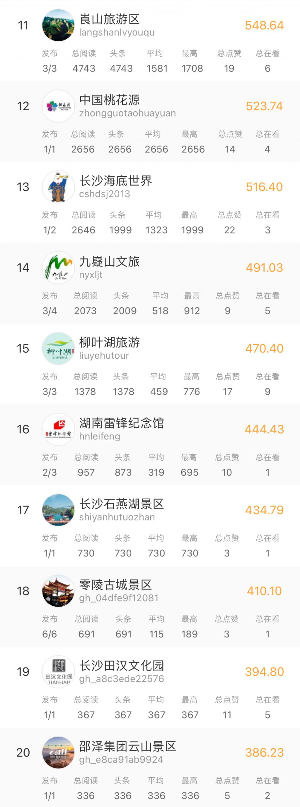 △ 湖南景区新媒体影响力周榜 11-20 名