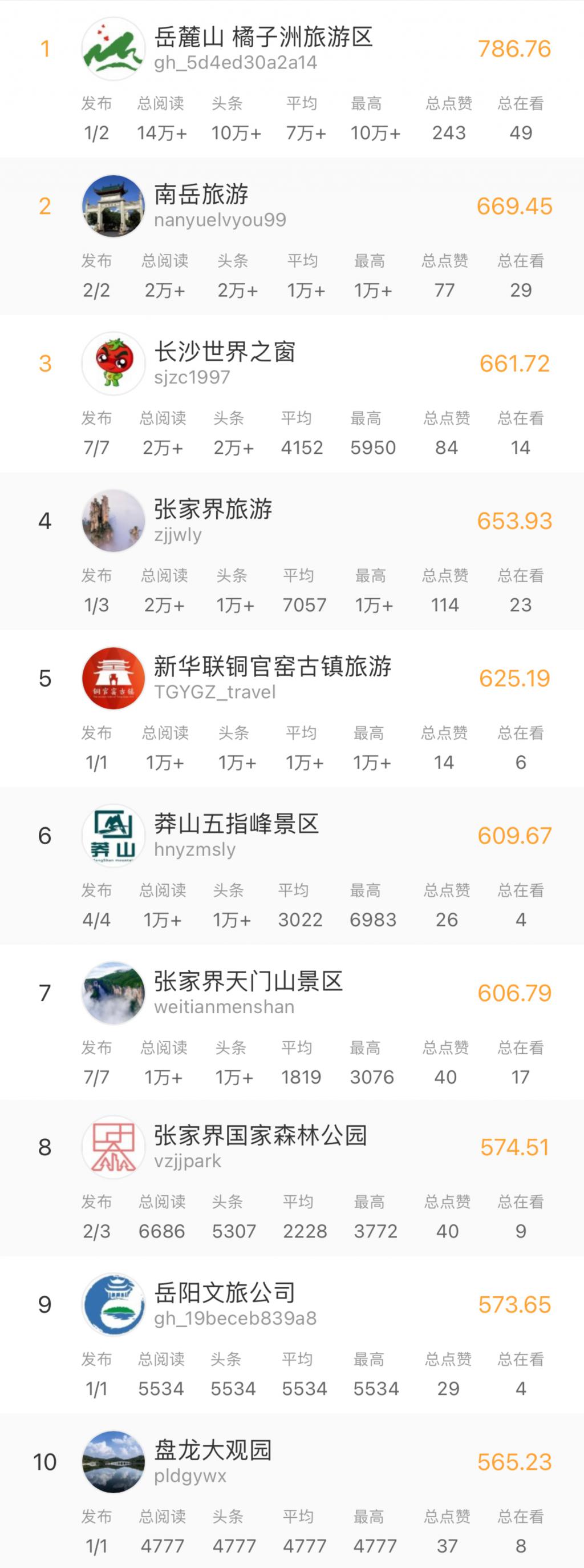 天边文旅此次重新整合天边榜单,以湖南省内 4A 级和 5A 级景区公众号为基础,新增部分人气景区公众号,结合相关公众号的实际活跃情况,统计出 100 个景区公众号为监测对象。以新榜平台发布的景区微信公众号文章数量、总阅读数、头条阅读数、平均阅读数、最高阅读数、总点赞数、总在看数以及新榜指数等数据为依据,根据各项数据的相应权重计算得出景区新媒体影响力排行。