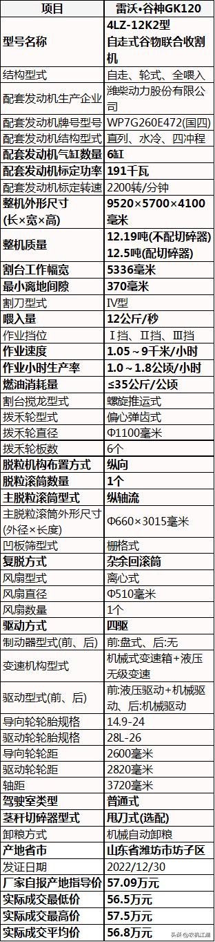 另外,在产地山东省的农机补贴查到,雷沃·谷神4LZ-12K2(GK120)型轮式谷物收割机,厂家自报产地省份指导价57.09万元。再从各地农机补贴系统中,公开的信息数据算出,实际成交平均价56.8万元。这两个价格相差0.29万元,价差几乎微乎其微。
