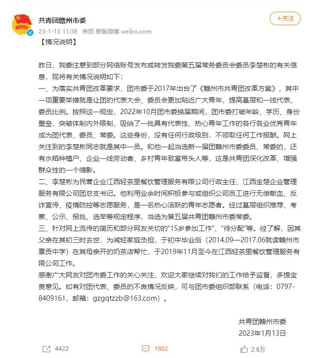 1月13日,共青团赣州市委发布情况说明。其中提到,团市委于2017年出台了《赣州市共青团改革方案》,2022年10月团市委换届期间,团市委打破年龄、学历、身份壁垒,突破体制内外限制,吸纳了一批具有代表性、热心青年工作的各行各业优秀青年成为团代表、委员、常委。这些身份,没有任何行政级别,不领取任何工作报酬。网上关注到的李楚彬同志就是其中一员。