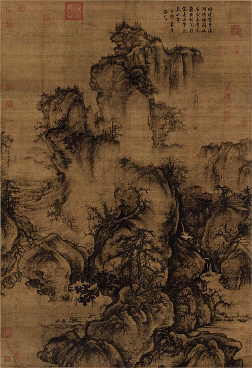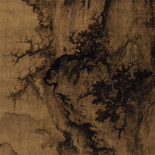 《早春图》构图上采用“十字”形章法,近景的窠石古木,中景的巨岩从柯,远景的主峰云冈,都被置于正中纵轴线上,两侧有曲涧栈道、茅亭层阁,从总体上构成上高、中平、下深“三远”兼备的壮巍气势,统一于画面空间中,创造出既深且广的视觉形象,达到了远观整体,气势宏大,近视局部,引人入胜的效果。这是作者对山川体悟的充分表达,是一种富有理想色彩的写实风格。
