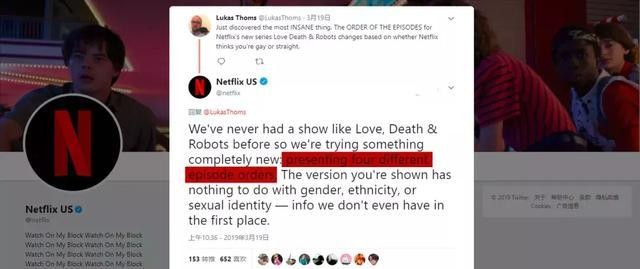 《爱,死亡和机器人》上线之后遭到了美国部分观众的质疑,认为奈飞会根据订阅用户的性别、性取向、收视偏好安排不同的排序,隐含着对用户的偏见。对此奈飞通过推特做出官方回应,坦言为《爱,死亡和机器人》设定了四个不同版本的排序,(最普遍的排序情况(也是中国观众看到的排序情况)以斗兽场复仇故事《桑尼的优势》开场,另有以《当酸奶统治世界》或《裂缝以外》等排在第一部的情况),只为测试观众偏好,并不基于观众特征做特别安排。