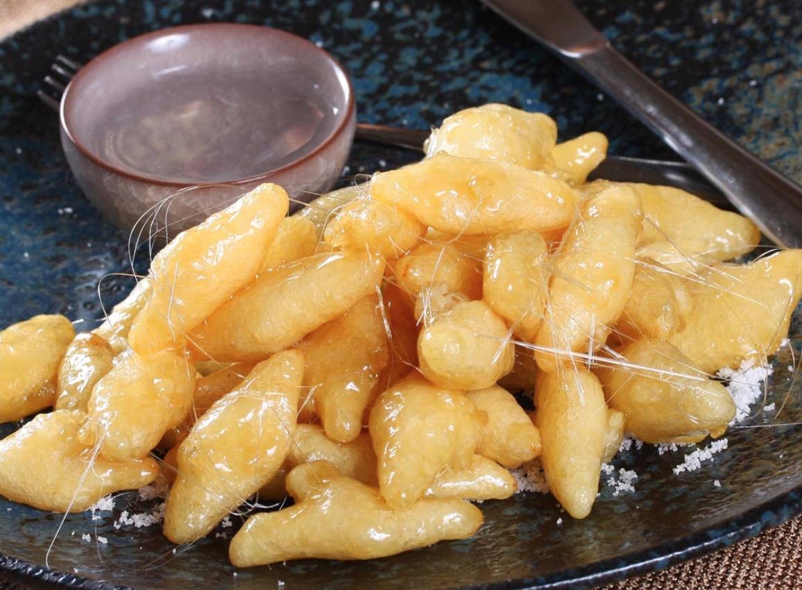 拔丝菜是山东省的汉族传统名菜,属于鲁菜菜系,拔丝白果的原料不是白果,而是以鸡蛋为主料,外观色泽金黄,块型光滑,味酸甜,外脆内软,糖丝绵长。春节盛宴,端上一盘拔丝菜,大家一齐下箸,金丝满席,趣味无穷。