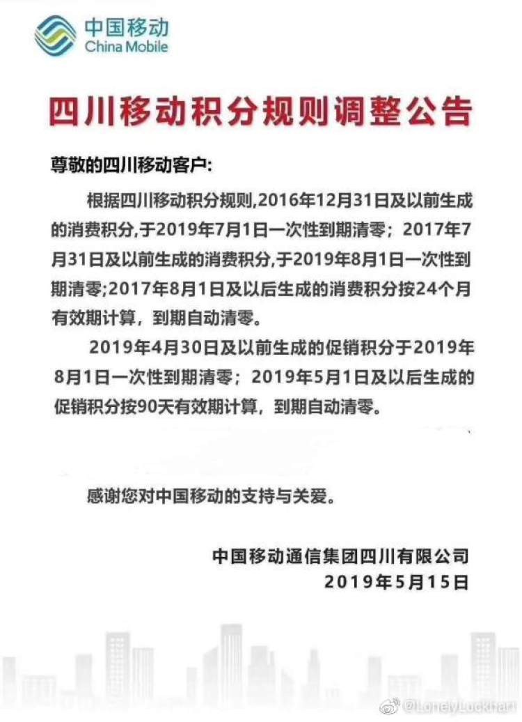 又如,四川移动则发布公告称,其用户在2016年12月31日及以前产生的消费积分,将于2019年7月1日一次性到期清零;在2017年12月31日及以前产生的消费积分,将于2019年8月1日一次性到期清零。