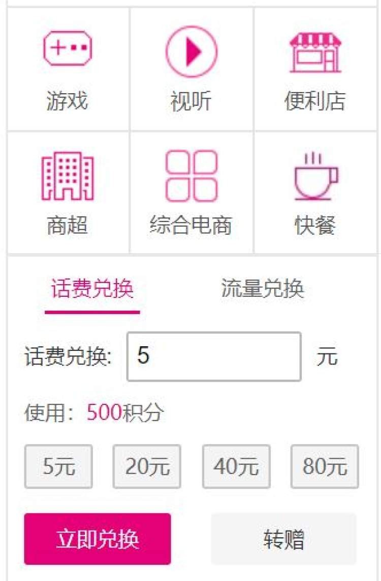 通过这个兑换入口可见,每100积分可兑换1元话费,单笔兑换5元起兑。流量兑换则有30MB、100MB、210MB等多个档次可供选择,所用积分从几百到几万不等。