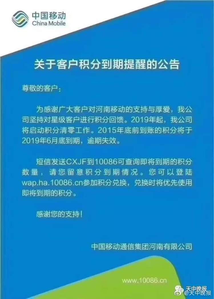 例如,河南移动发布公告称,其用户在2015年底前到账的积分将于2019年6月底到期,逾期失效。