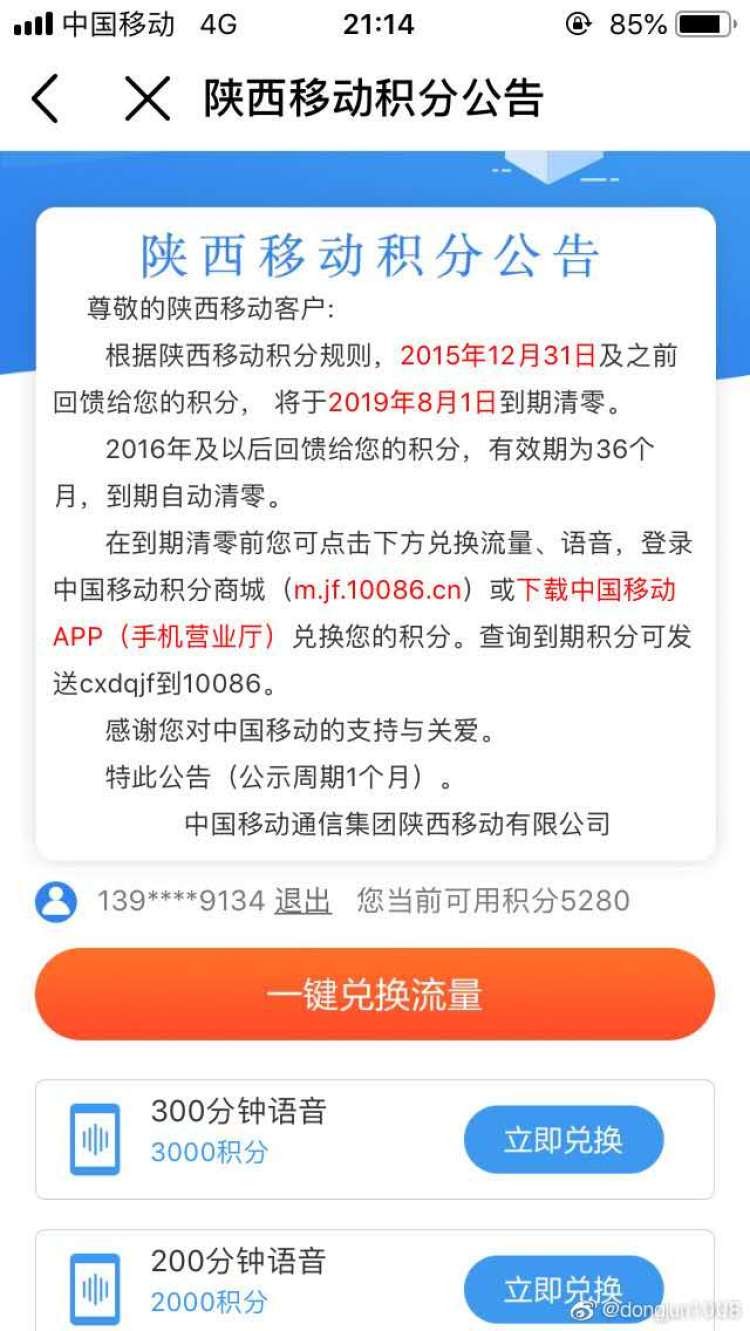 而陕西移动也发布公告称,其用户在2015年12月31日及以前产生的消费积分,将于2019年8月1日到期清零。