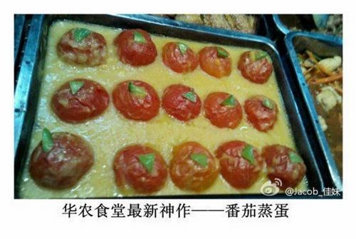 这是华南农业大学食堂推出的新菜式——番茄蒸蛋。从图片上看,西红柿还是完整的,只是,鸡蛋已完全碎去。有网友称,这道菜应该叫“蛋蒸番茄”。还有网友调侃道:“大师傅,请别再打扰番茄和鸡蛋粉身碎骨的爱情!” 然而,据说,“番茄蒸蛋”实为挖空大番茄加入猪肉末与玉米粒,放在浓稠香醇的玉米羹里蒸出来的。原来这道菜里压根儿就没有鸡蛋!食堂的大师傅,您真是费心了!