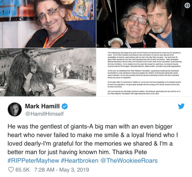 “星战的大家庭对他(彼德·梅犹)而言意义重大,那并不仅仅是一个电影角色而已……在过去超过30年的时间里,彼德和世界各地的友人和粉丝们一同成长、彼此陪伴。”彼德·梅犹的家人在声明中写道。