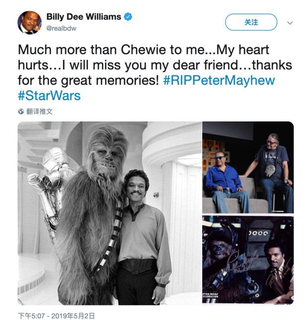 《星战》的主创在推特上发文悼念。