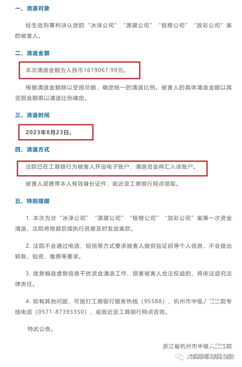 清退方式:委托工商银行为被害人开设电子账户,法院执行时会将清退资金汇入该账户。