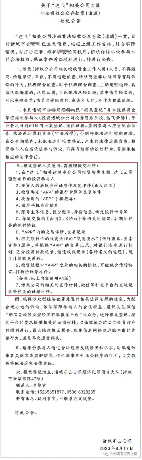 2023年8月17日,关于“达飞”相关公司涉嫌非法吸收公众存款案(诸城)登记公告发布。