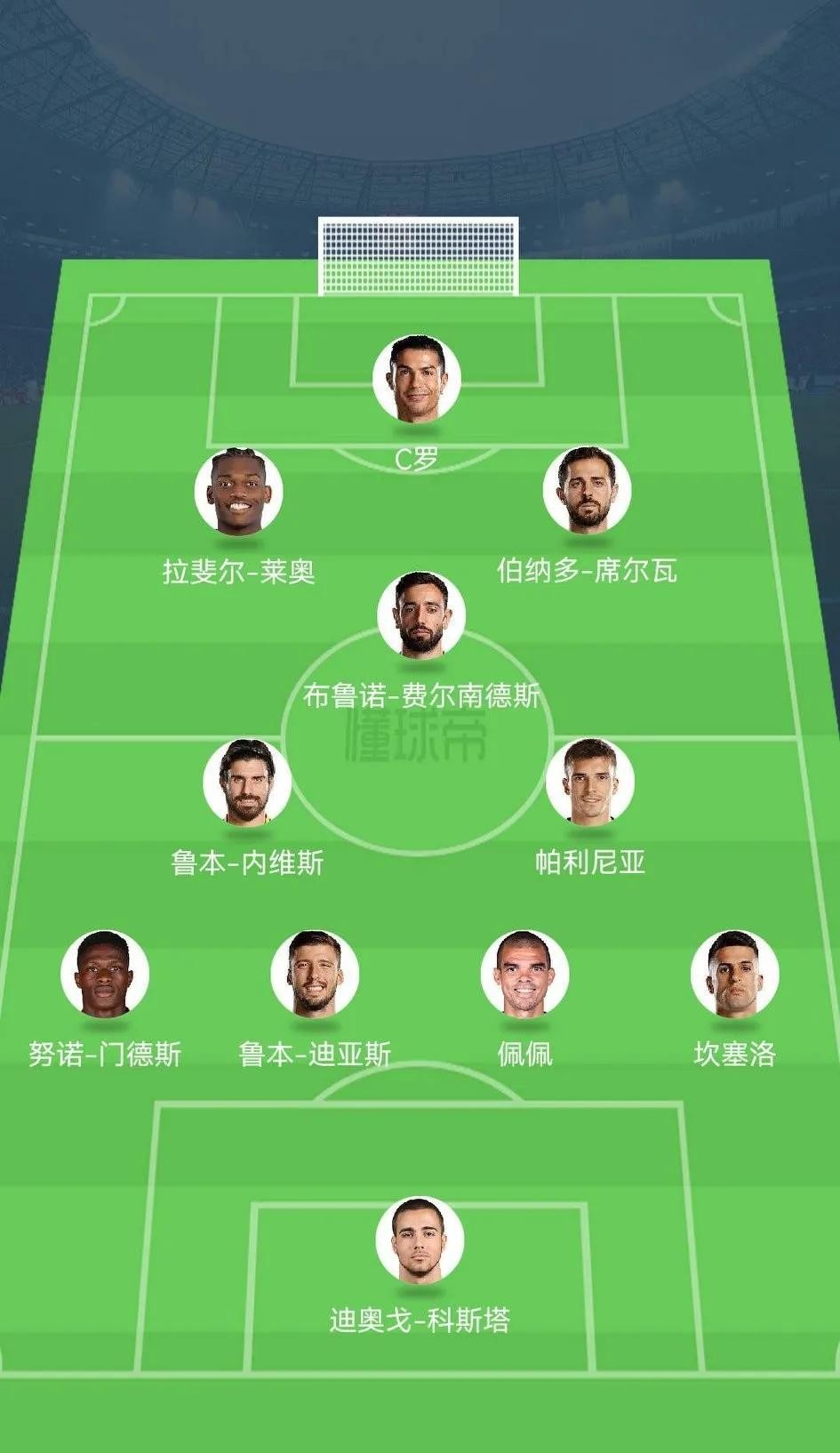 中场:鲁本·内维斯、帕利尼亚、布鲁诺·费尔南德斯