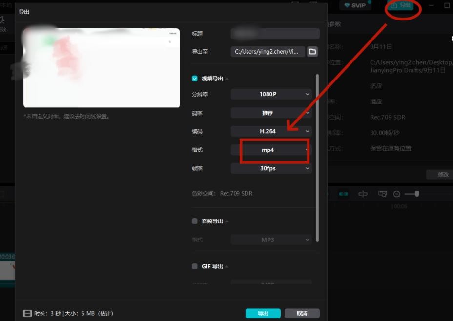 步骤3,点击“导出”,在剪映支持的mp4、mov两种格式中进行选择。
