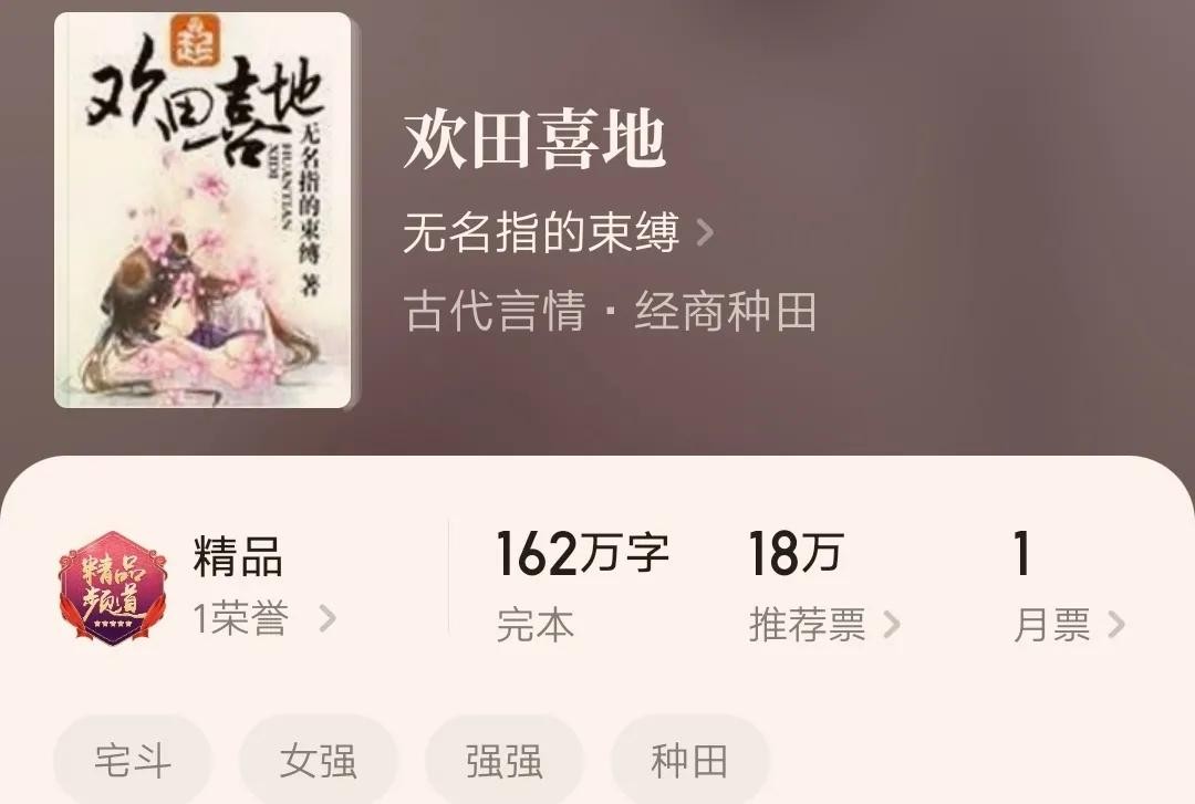 2.《欢田喜地》,作者无名指的束缚,全文字数162.02万