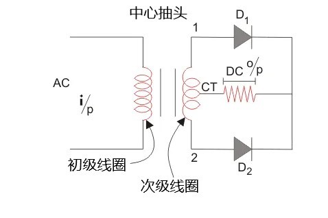 1、使用一个中心抽头变压器和两个二极管,这被称为中心抽头全波整流电路。