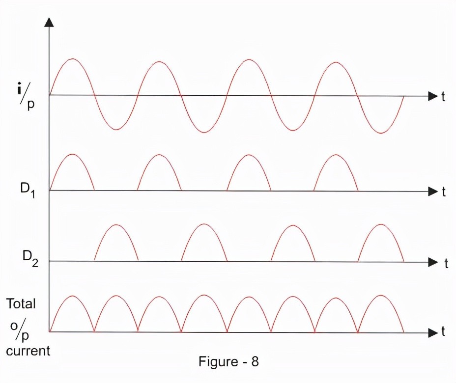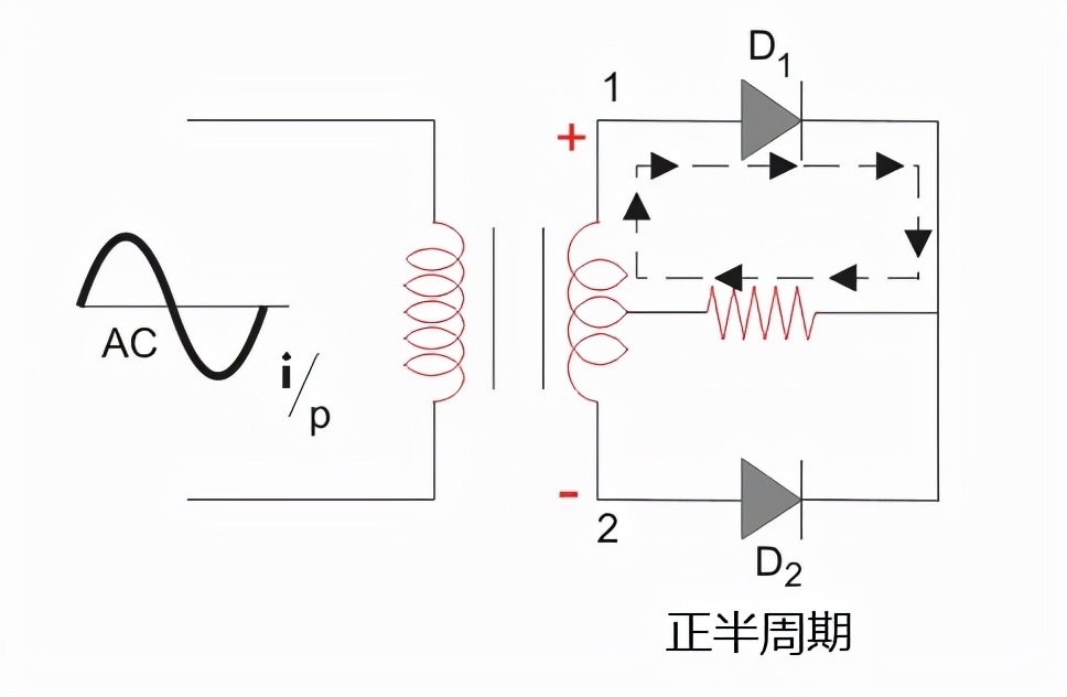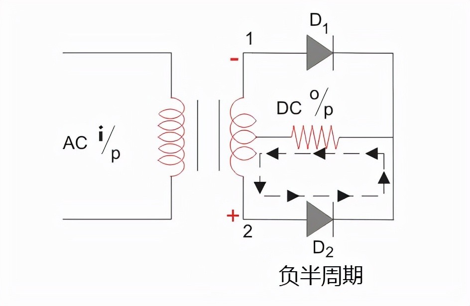 在正周期期间,二极管D 1导通,在负周期期间,二极管D 2在正周期期间导通。