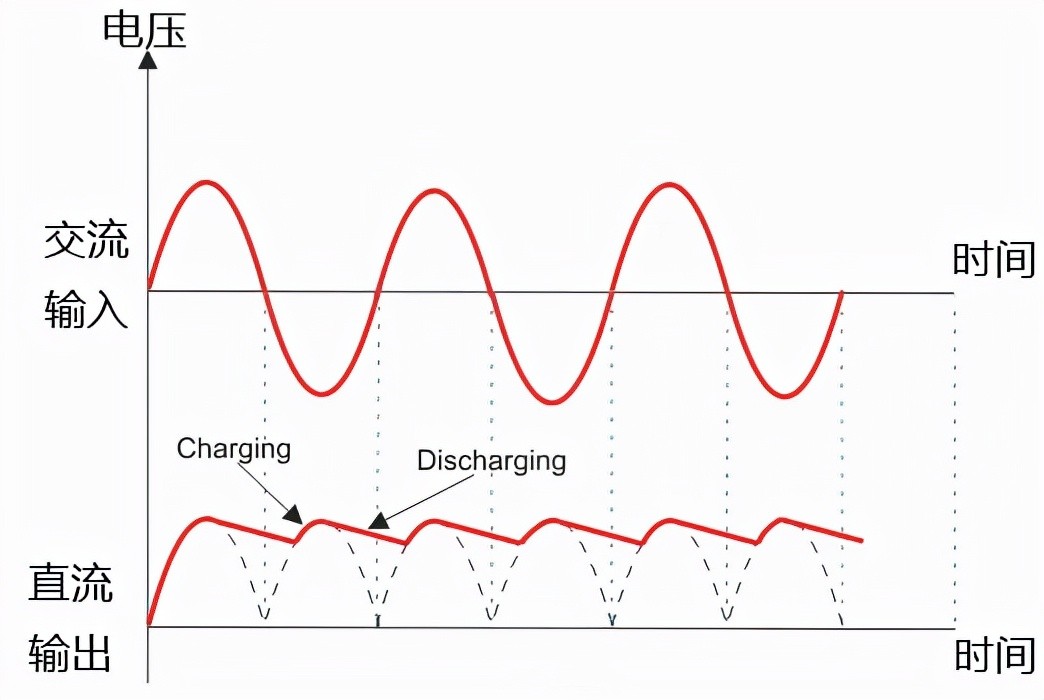 因此,为了将脉动直流电压转换为纯直流电压,使用如上所示的滤波电路。在这里,在负载上放置一个电容。