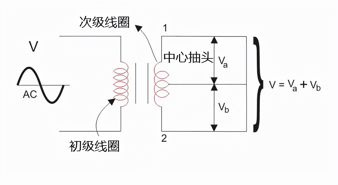 中心抽头变压器:就是一个稍稍修改了普通的变压器,它有一根额外的导线连接到次级绕组的确切中心。这种结构将交流电压分成两个相等且相反的电压,即+Ve电压(V a)和-Ve电压(V b)。总输出电压为: