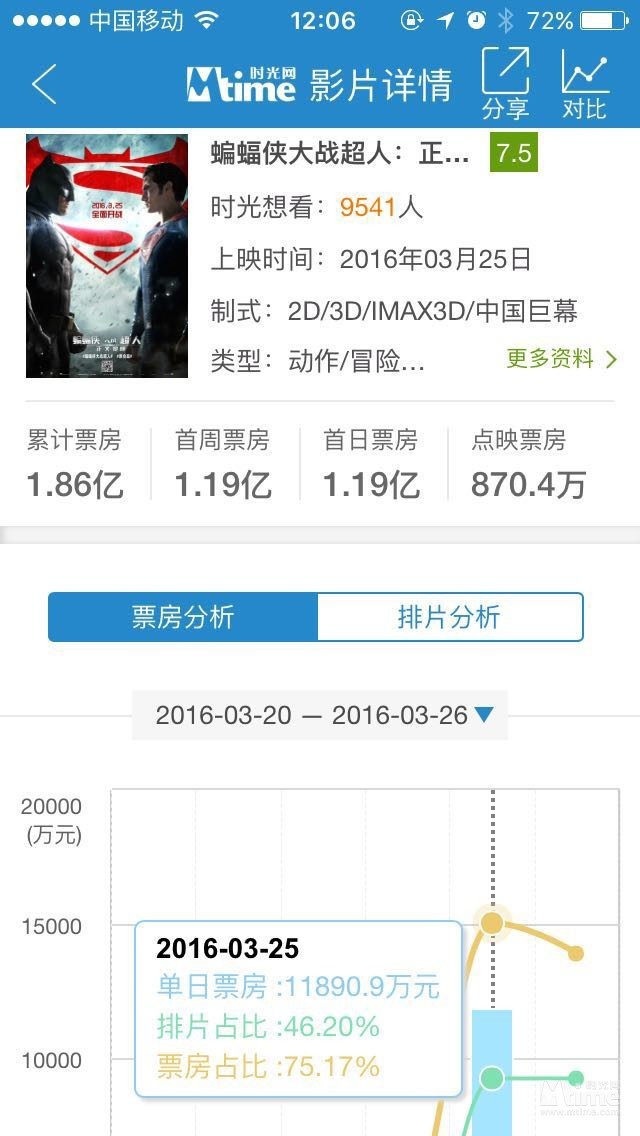时光网讯 3月25日,DC超级英雄电影《蝙蝠侠大战超人:正义黎明》在内地正式开画。因为时差问题,中国观众比北美观众提早半天一睹蝙蝠侠与超人的风采。而在票房方面,《蝙超》的内地首日进账1.19亿人民币,险胜2013年上映的《钢铁侠3》(内地首日票房1.16亿),与去年9月内地上映的动画电影《小黄人大眼萌》1.17亿的首日票房接近。而目前排在内地引进片首日票房前三的则仍旧是《速度与激情7》(3.5亿)、《复仇者联盟2:奥创纪元》(1.9亿)以及《星球大战:原力觉醒》(1.87亿)。