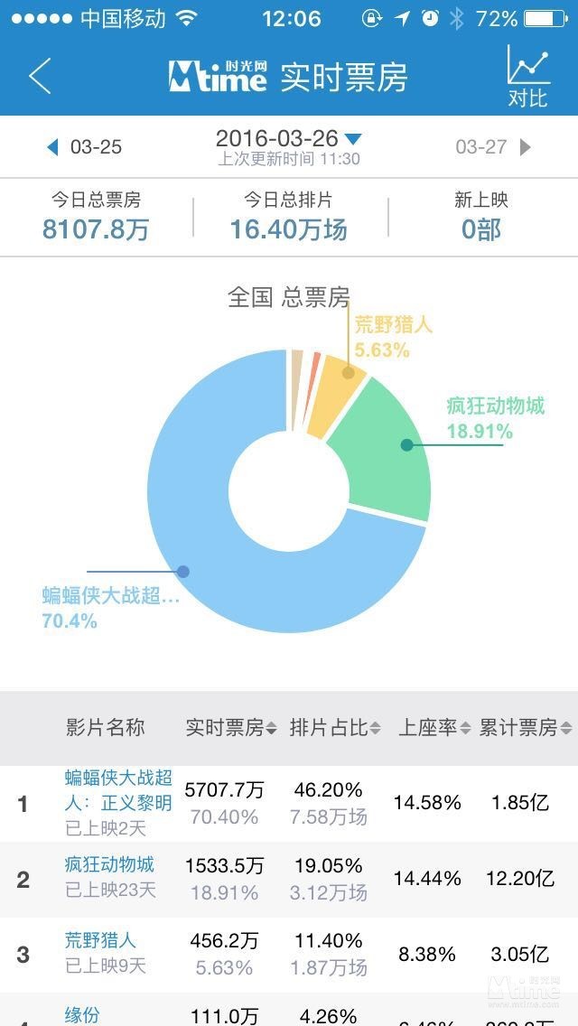 截至3月26日上午11:30,《蝙超》内地累计票房已达1.86亿,影片排片占比为46.2%。与其他好莱坞大片相比,该排片占比不算太高。根据包括时光网在内的各大电影售票系统看,北京、上海、南京、深圳、大连等大城市的星美院线并未安排《蝙超》的放映场次。据星美院线某影院经理对时光网记者透露,他们接到的通知是,由于密钥制作技术问题,未安排《蝙超》影院排片。另有消息称,星美院线因拖欠分账款项,没有拿到《蝙超》的密钥,但此消息有待进一步证实。